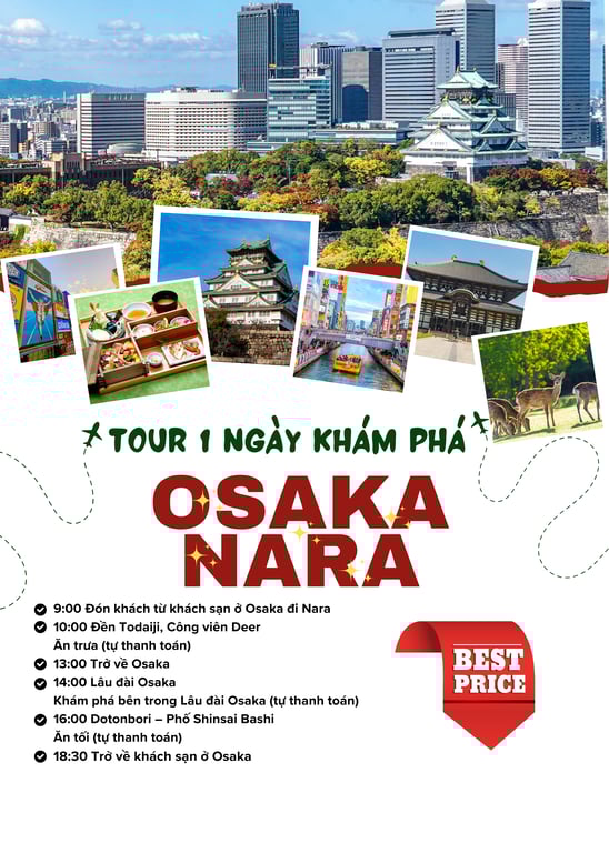 🦌 Nara – Cố đô thanh bình với nai hoang dã và ngôi chùa cổ kính. 🌉 Osaka – Thành phố sôi động, nổi bật với lâu đài và ẩm thực, mua sắm.